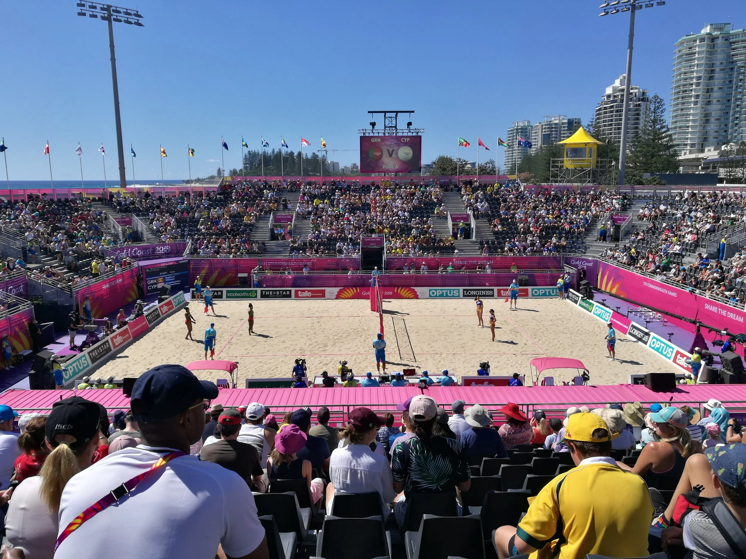 Yesterday we traveled further down the Gold Coast, towards Coolangatta, known for being the home of Beach Volleyball at this Commonwealth Games. This sand-filled sport is making its Games debut and there aren't many better spots around the globe to accommodate for the beach location, the surf and the party atmosphere. Beach Volleyball has a unique atmosphere which sets it apart from other venues and sports, it's a constant feed of music, exhilarating back and forth rallies and crowd participation. All fans who attend a game are expected to get up out of their seats and make some noise, from Mexican waves to 'kiss cam', they will get you!